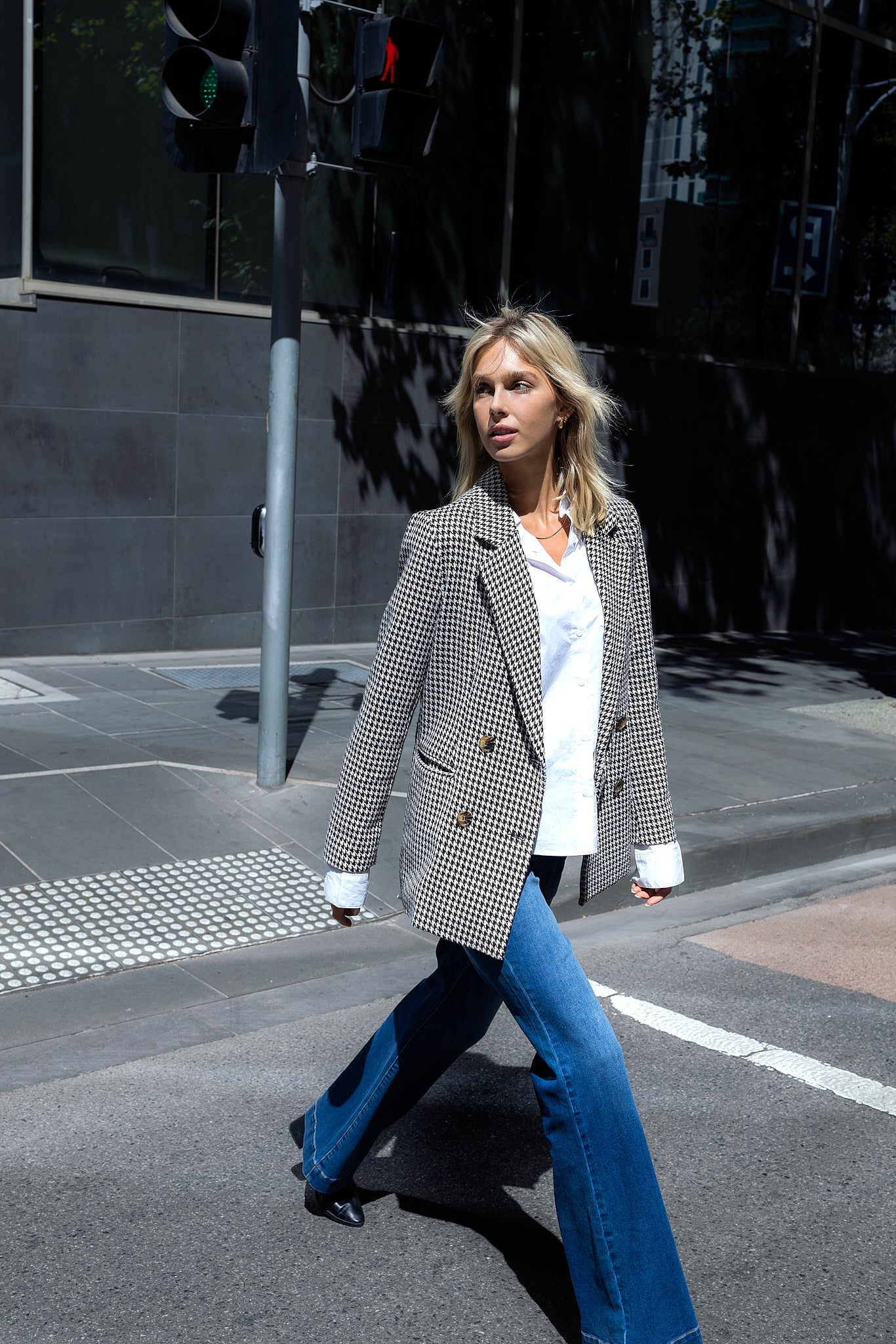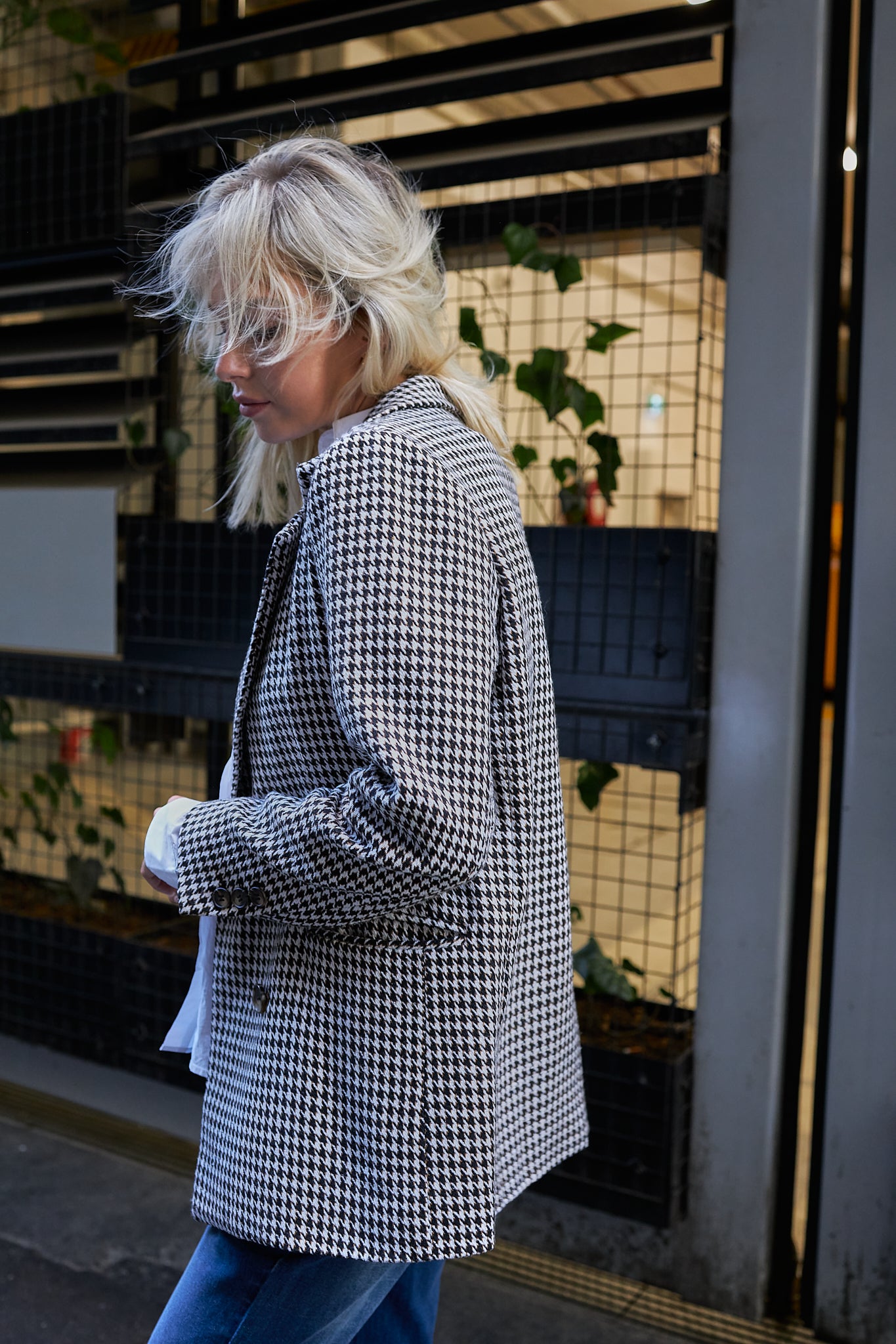 The Dylan Blazer is crafted from a textured houndstooth blend pattern in cream, chocolate and black. This tailored-inspired style is fully lined featuring an interior chest pocket, three-button cuffs, and two welt pockets at the front waist. A double-breasted front closure with two buttons makes for a timeless classic.