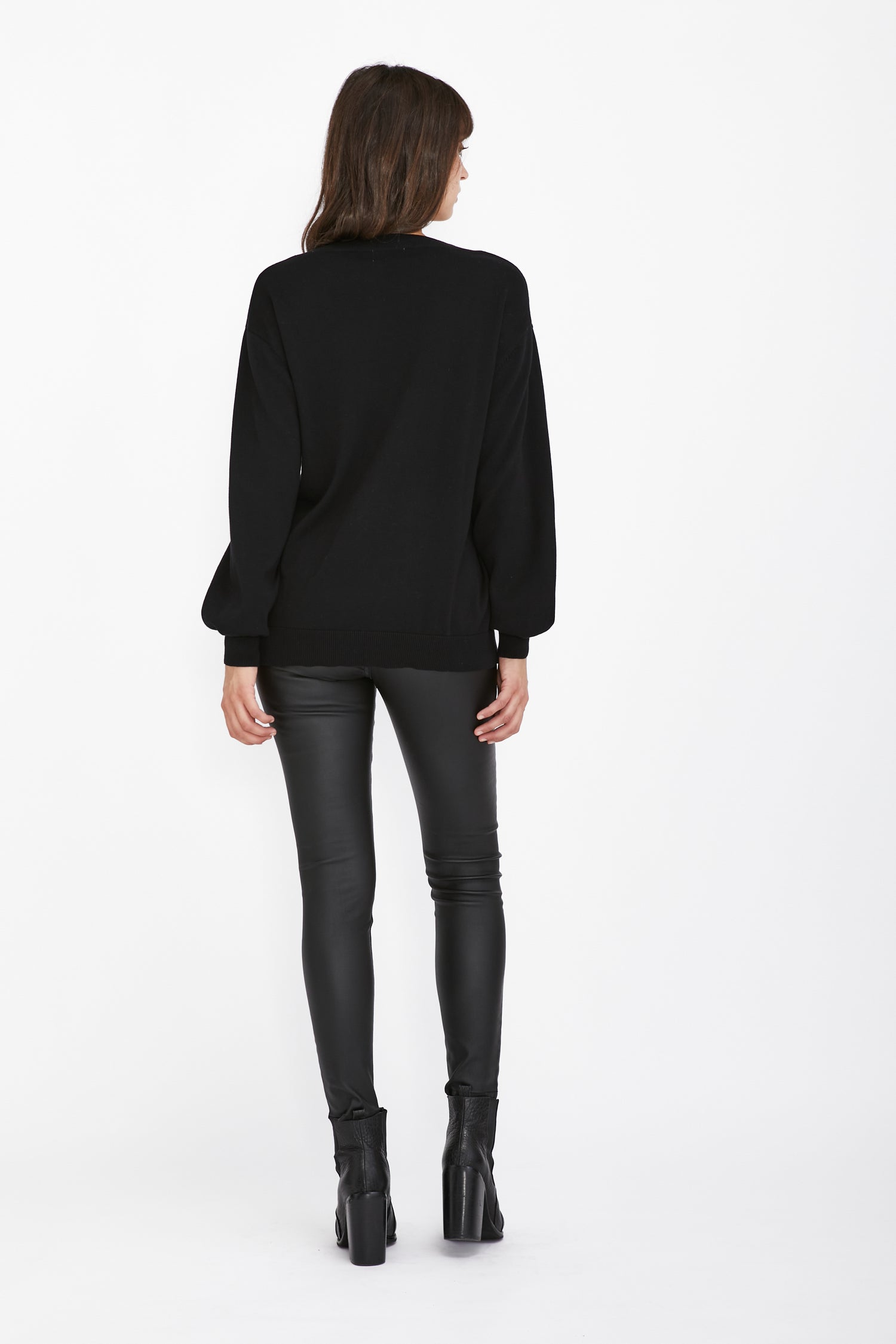 Relaxed fit, wide sleeved knit. Soft Cotton knit. Crew neck. Perfect for layering over a white shirt or tank. Good weight to wear under a blazer or heavier coat.