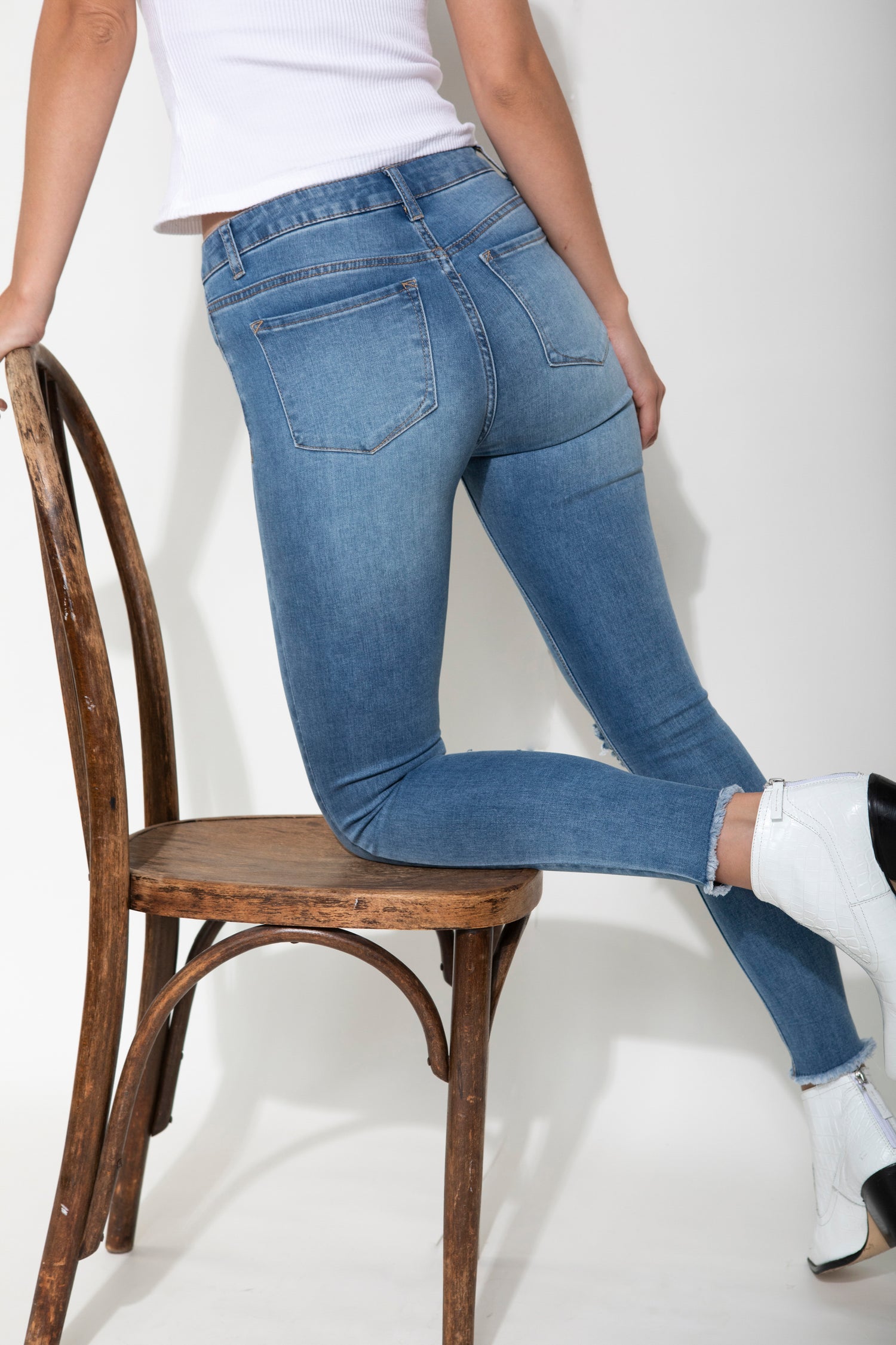 Mila Highwaisted Stretch Denim Jean. Super Skinny leg. Soft Stretch Denim. Sits high on the waist. Mid-Blue rinse with rips on legs.