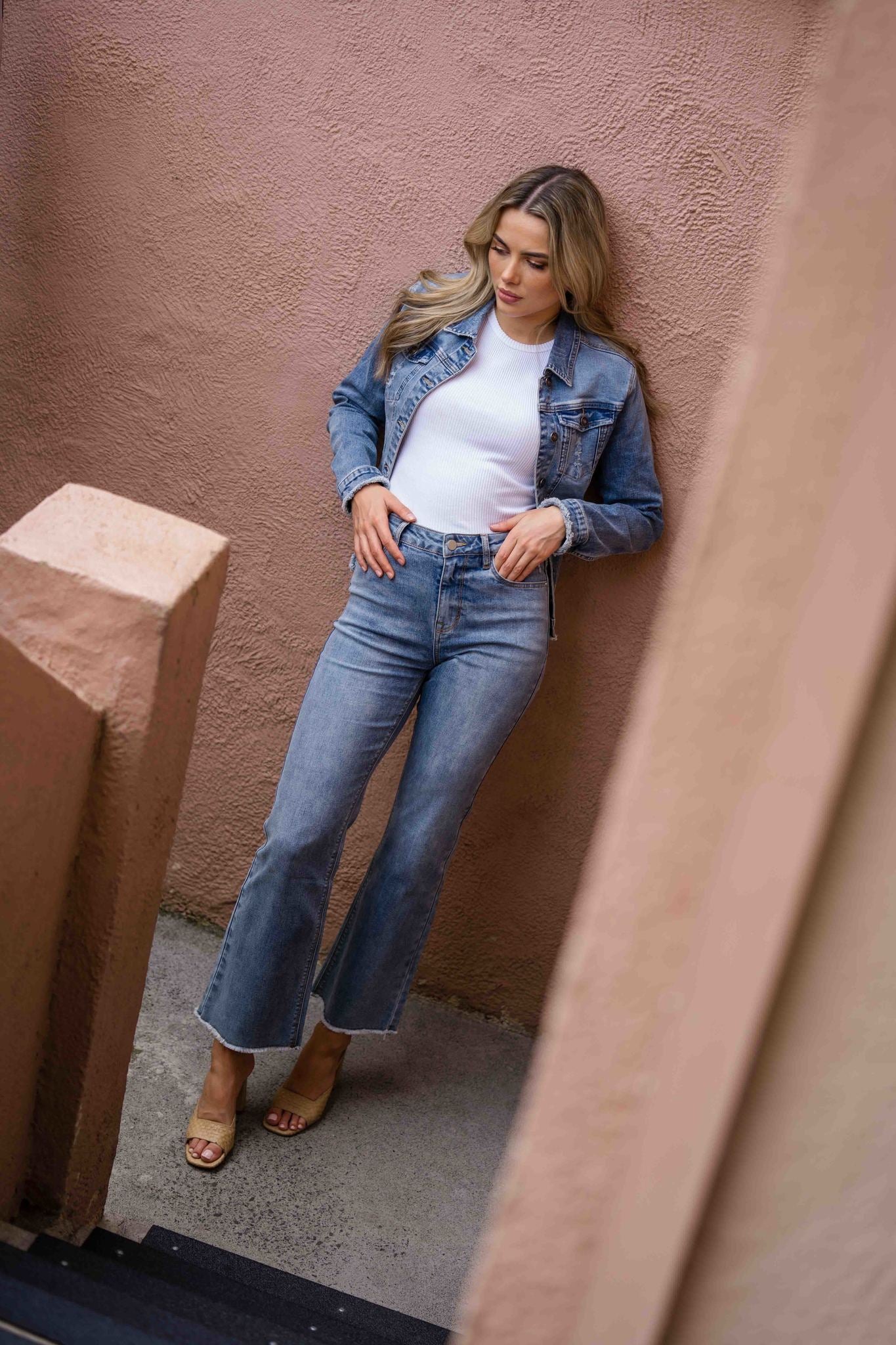 The latest addition to our denim collection is the Molly Flare Jean. Constructed and cut from the same amazing denim of the Lucia Jean in a mid-blue vintage wash. Fitted through rise and hips and flared to the ankle.