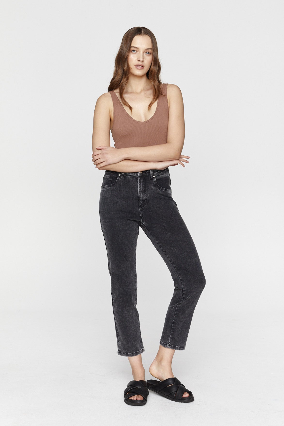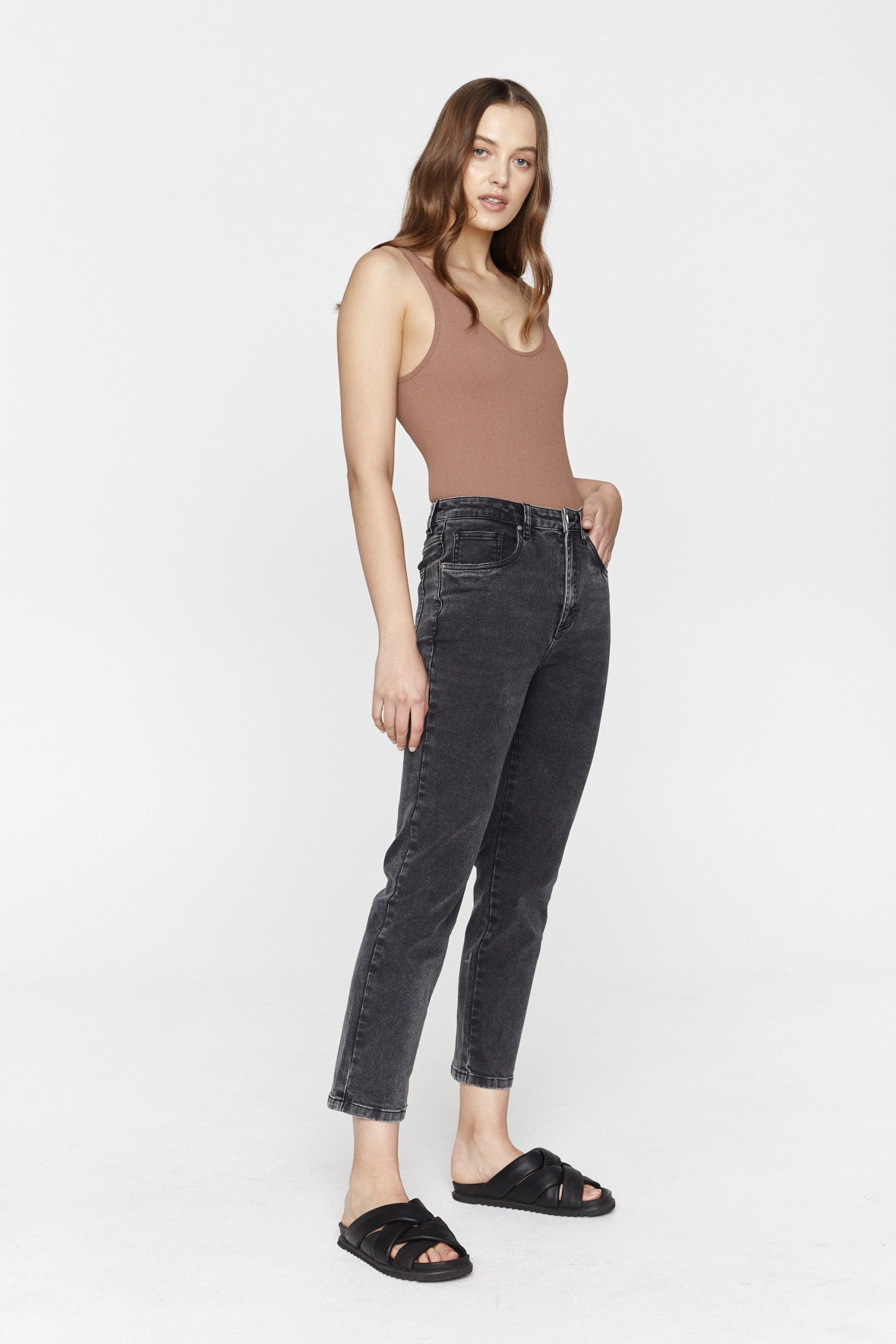 The Noelle denim jean. Relaxed Straight Leg Jean. Crop length with a high waist. Dark Charcoal Wash.